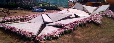 The winning garden is a first time collaboration with garden designer and brother of the artist Tom Harfleet. Together they have designed a confrontational ‘shattered’ structure made of slabs of concrete placed at various gradients and under-planted with a total of four thousand pansies. This is intended to metaphorically reflect the disruptive nature of homophobic hate crime on contemporary society.